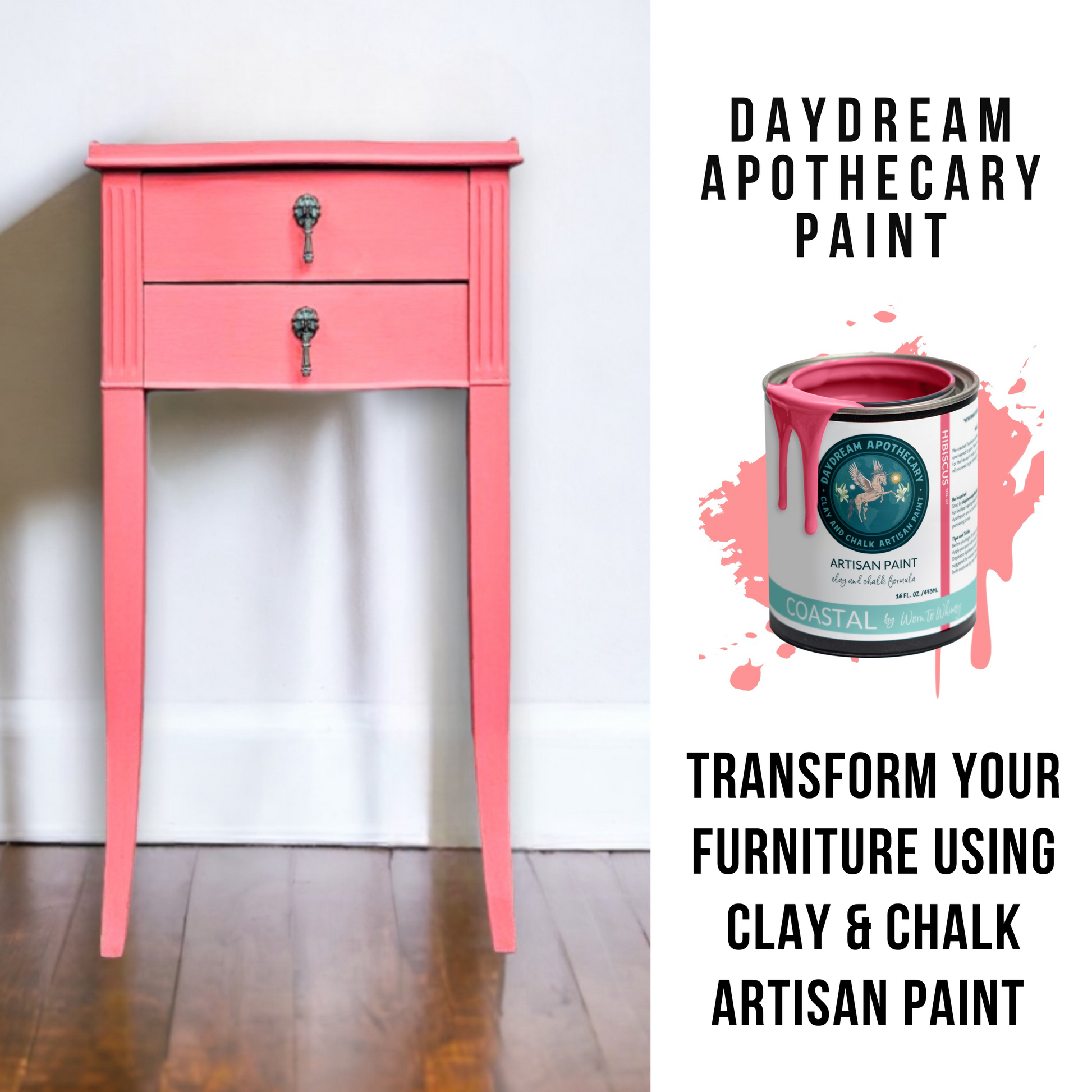 Daydream Apothecary has created the most vibrant paint for artists and DIY furniture designers. Our proprietary artisan paint formula, has low volatile organic compounds (VOCs), reconstitutes with water, and blends beautifully. This amazing new hybrid clay and chalk formula, was designed to adhere to most all surfaces without the need to prep or prime.
