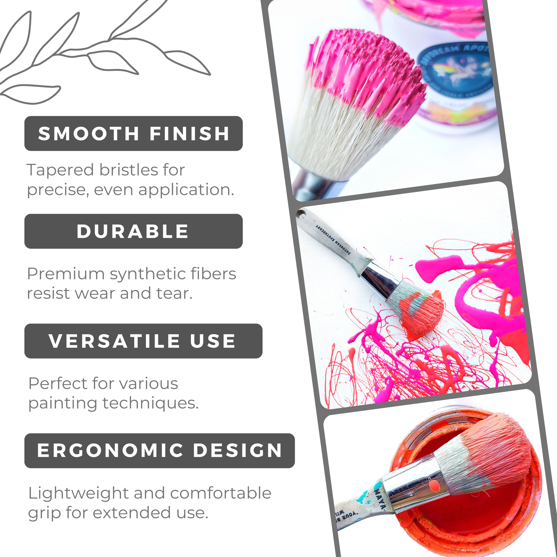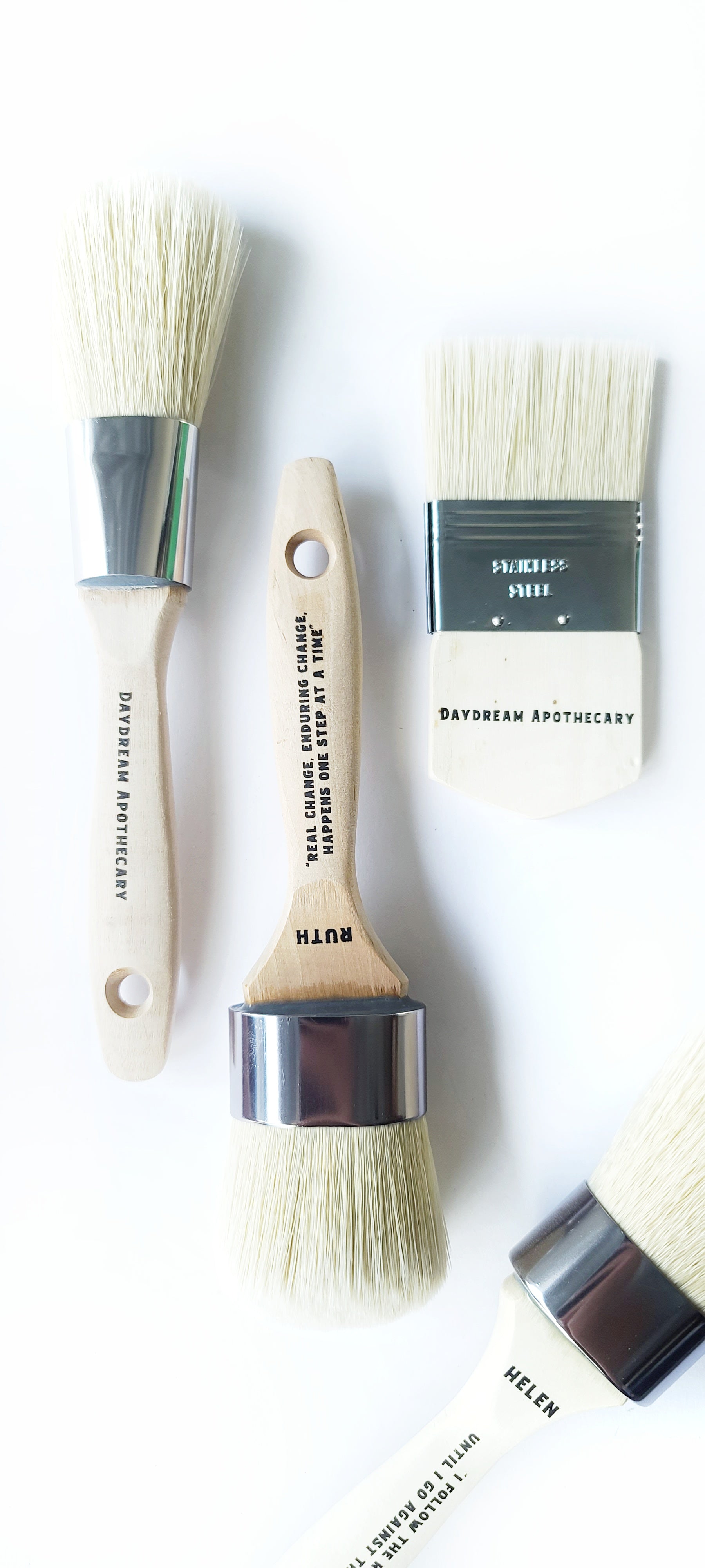 Daydream Apothecary specialty Clay and Chalk Artisan Paint brushes are hand crafted from soft yet durable chisel-tipped techno-synthetic white bristles. Every brush is securely epoxied into a beautiful and sturdy kiln dried white birch handle designed for superior comfort. The contoured oval brush head is densely-packed to hold more paint while our flat brush is ideal for blending and those hard to reach places. Our brushes are specifically designed to perform beautifully on all surfaces, for all chalk painting techniques as well as wax and top coat application.
