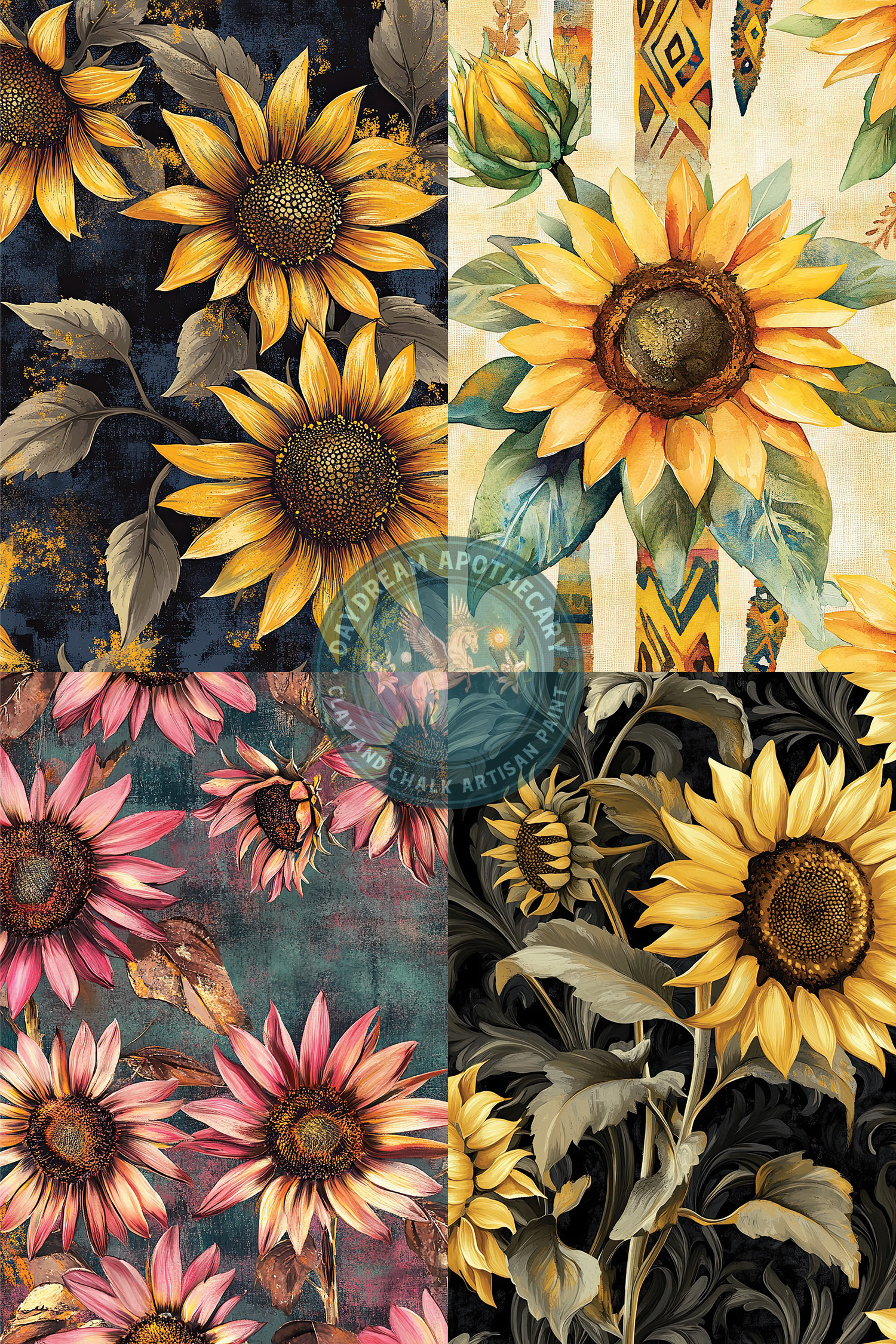 This paper features four beautiful images in one! Measuring a total of 36 by 24 inches it includes four artist curated sunflower designs perfect for your smaller furniture and crafts. Each individual image measures 18 by 12 inches.