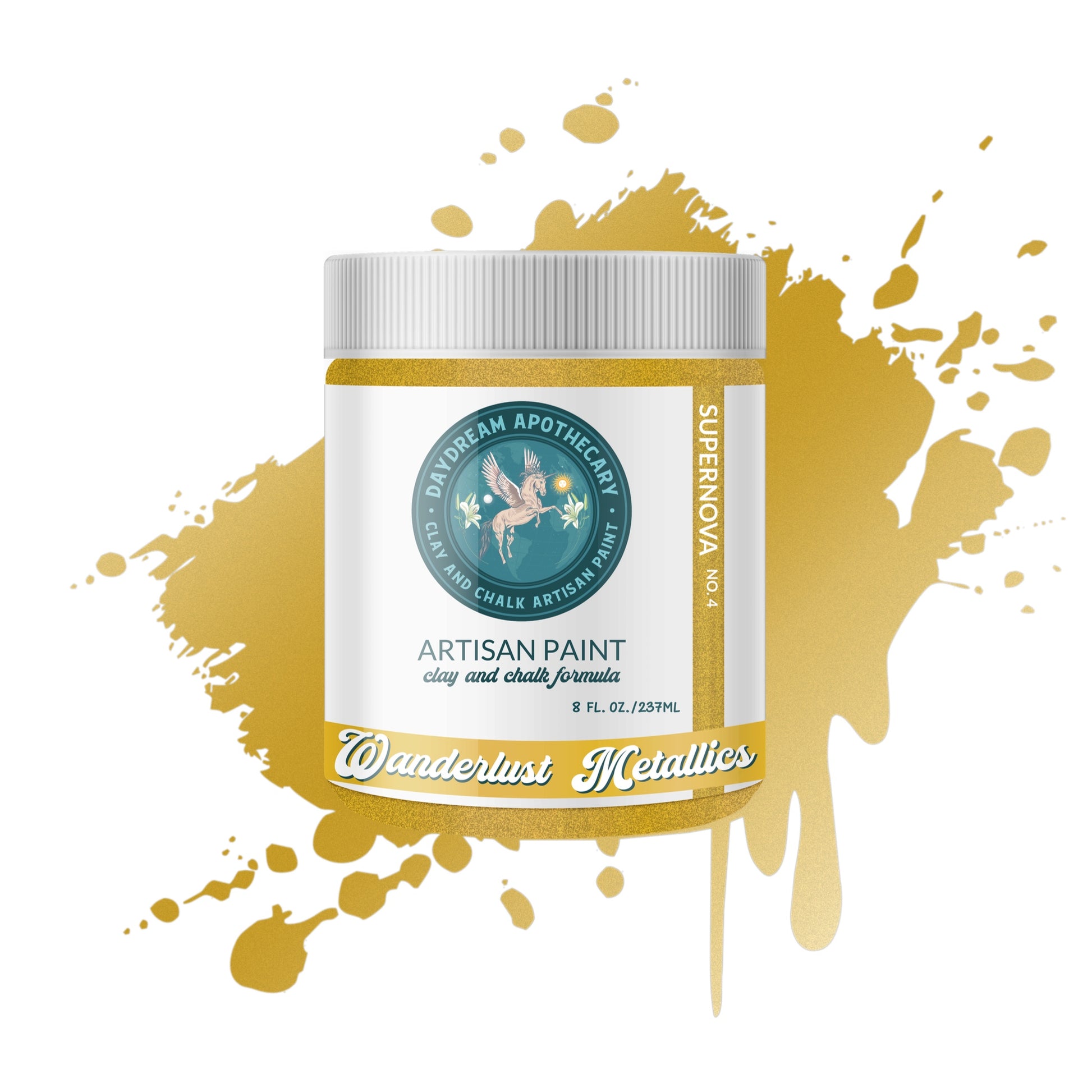Transform your next project into a work of art with Wanderlust Metallics in Super Nova . This luminous clay and chalk gold paint offers amazing coverage and a vibrant finish that will make any surface sparkle. Create beautiful, timeless results with one Product.