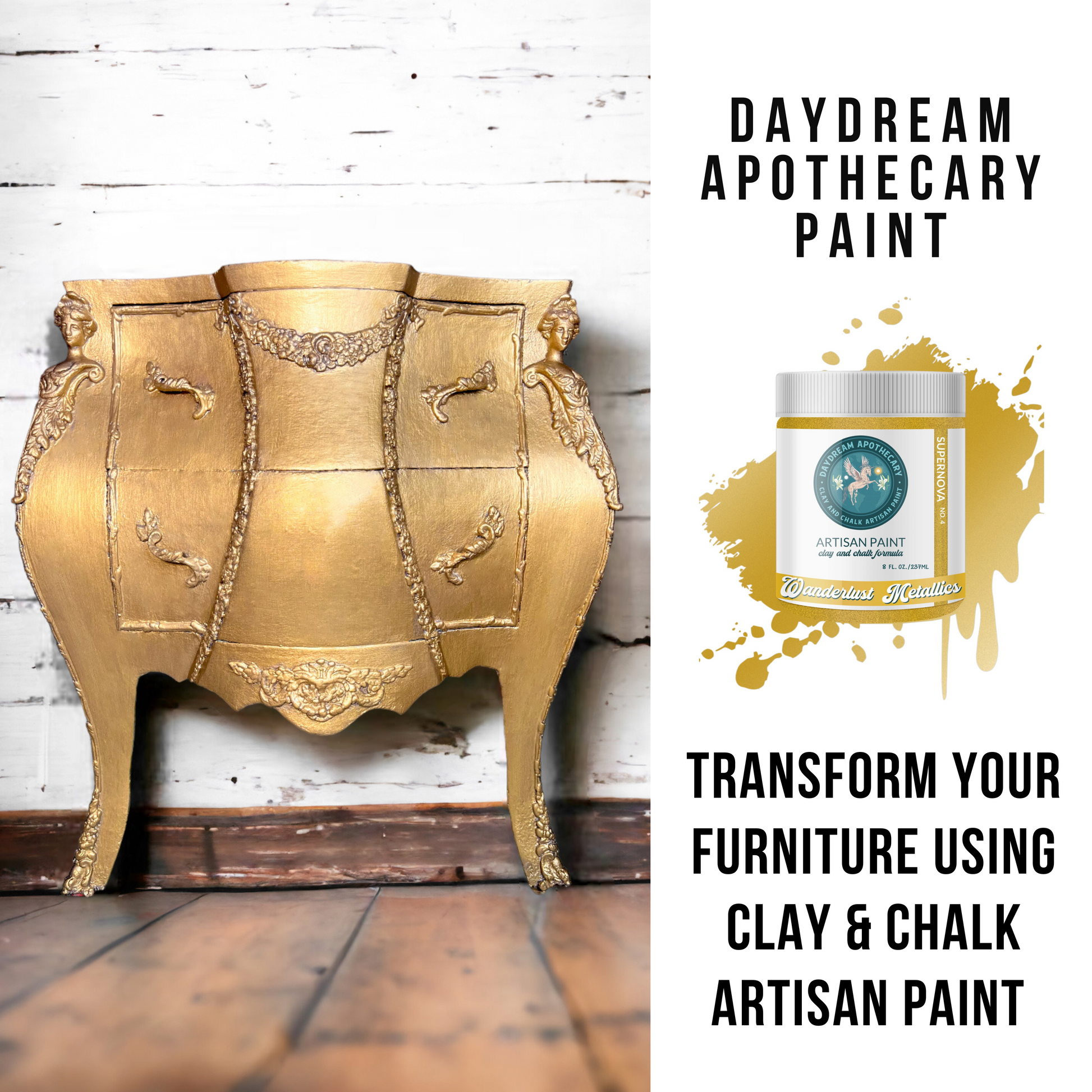 Daydream Apothecary has created the most vibrant paint for artists and DIY furniture designers. Our proprietary artisan paint formula, has low volatile organic compounds (VOCs), reconstitutes with water, and blends beautifully. This amazing new hybrid water based clay and chalk formula, was designed to adhere to most all surfaces without the need to prep or prime.
